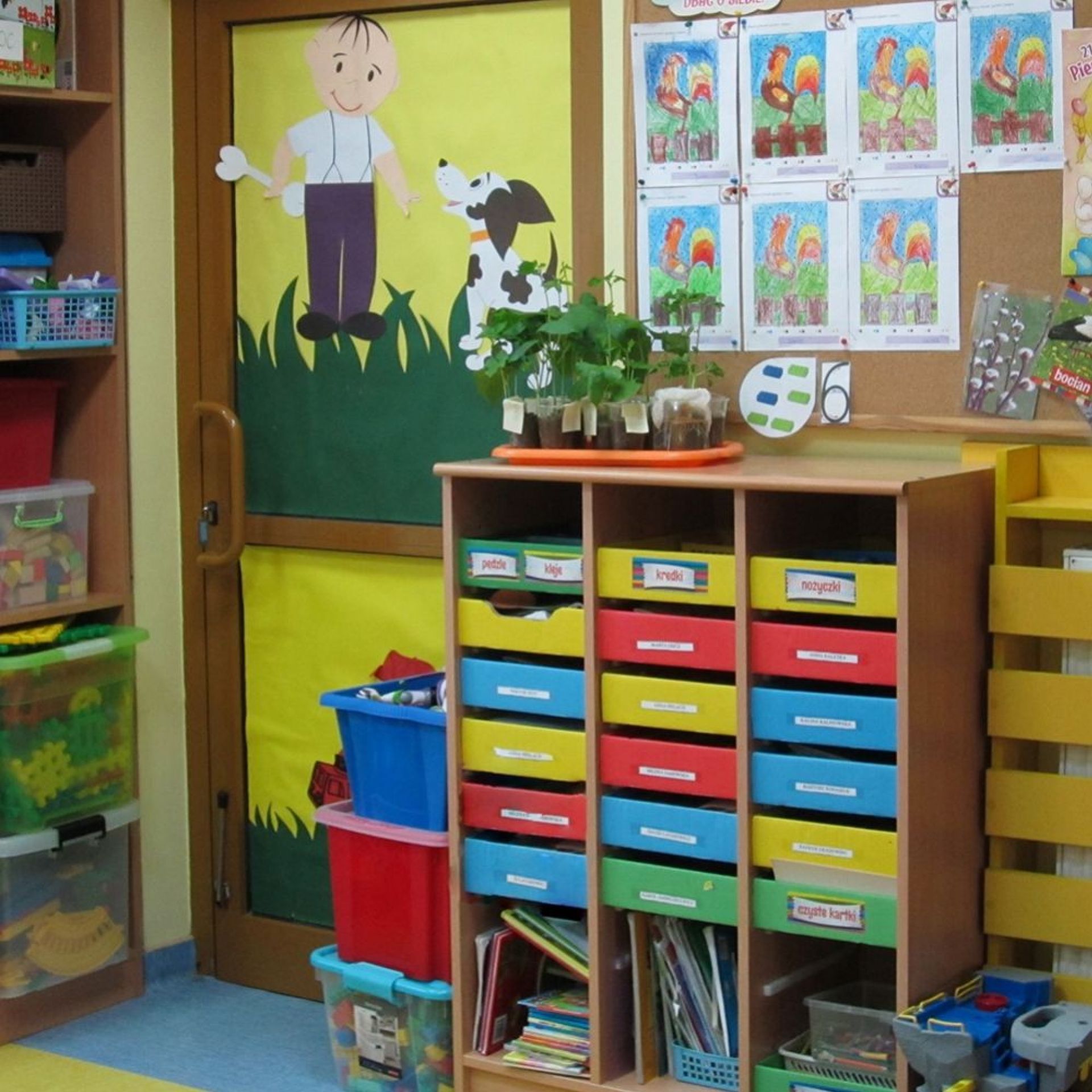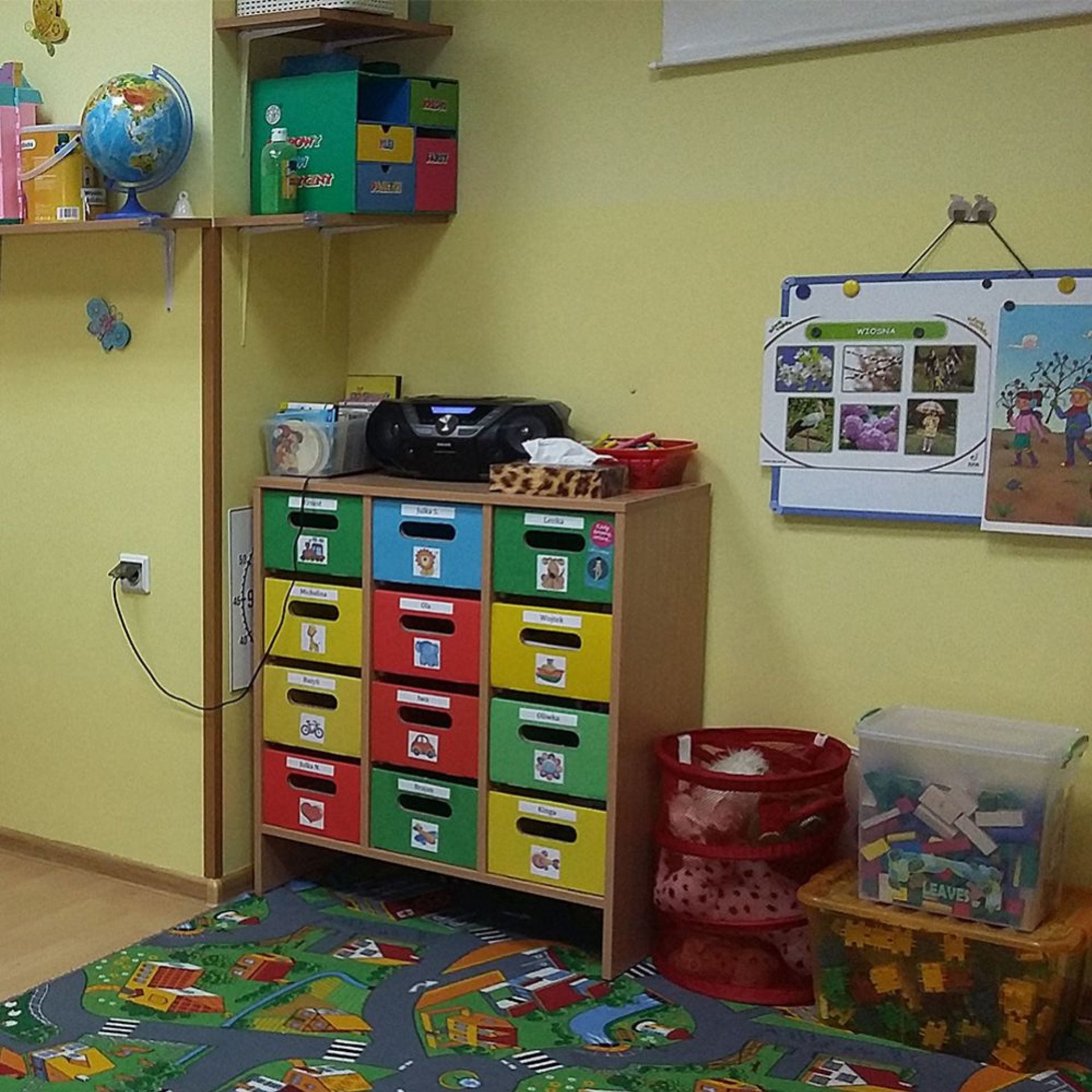 W szatni każde dziecko ma swoją półeczkę, która jest podpisana,a w przypadku maluchów oznaczona kolorowym znaczkiem.